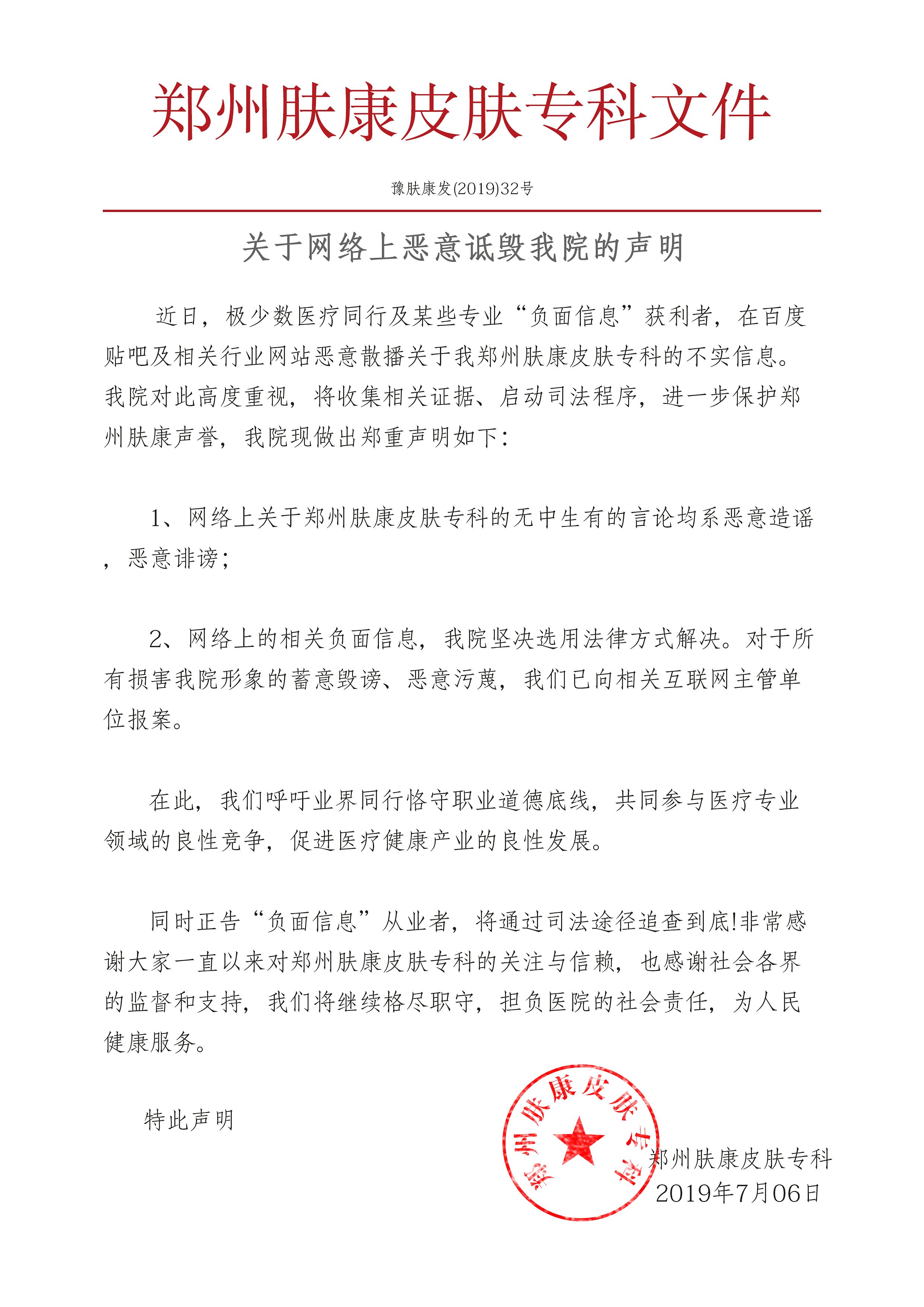 近日,极少数医疗同行及某些专业“负面信息”获利者,在百度贴吧及相关行业网站恶意散播关于我郑州肤康皮肤专科的不实信息。我院对此高度重视,将收集相关证据、启动私发程序,进一步保护郑州肤康声誉,我院现做出郑重声明如下: