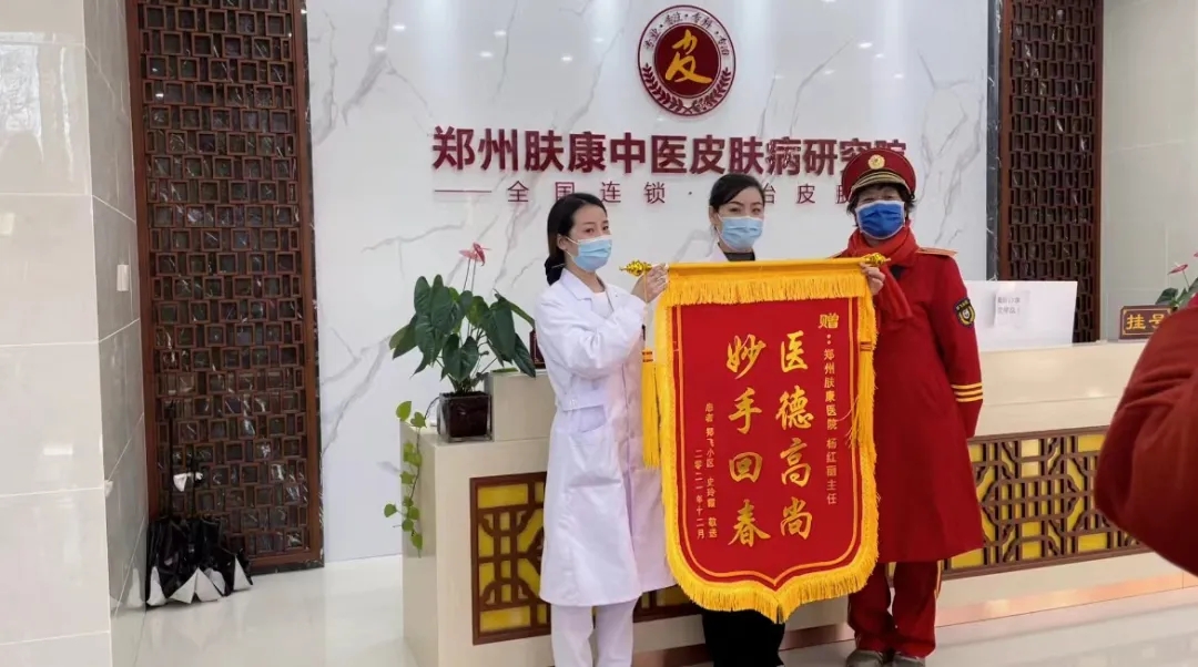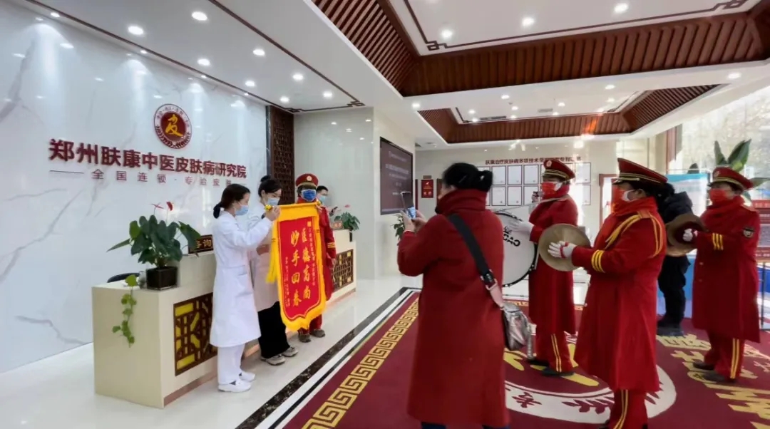 12月21日,一大早,郑州肤康皮肤病医院门口欢快的锣鼓声吸引了周围群众的注意。只见十来个身着统一红色队服的人组成的锣鼓队,站在前面的人拿着一面锦旗。